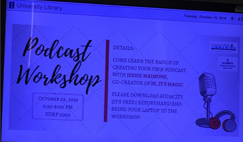 - Attend the Podcast Workshop sponsored by the Library and University Housing next Tuesday 10/29 in SDRP 2005 (aka Ikenberry Commons) from 6:30pm to 8pm. Using knowledge from the workshop, produce a short (approximately 30 seconds) audio file that summarizes one of the points you learned from the workshop. Upload to the appropriate folder on Drive. Worth 5 points.